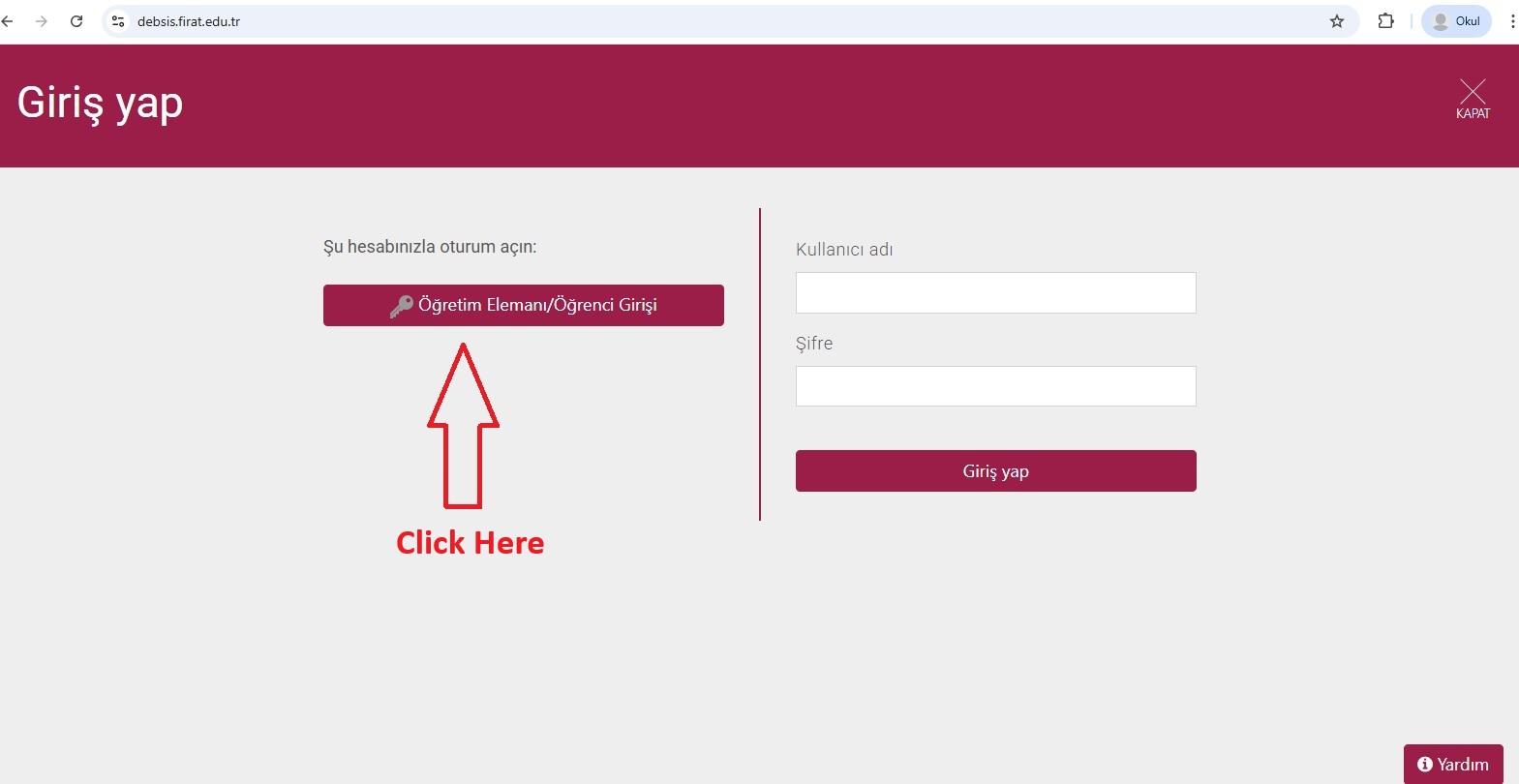 After entering the address above, click the "Log in" button. On the next page, click the "Teacher / Student Login" button, enter your username (student number) and password, and log in to the system. You can view the course activities by clicking on the course you wish to attend.