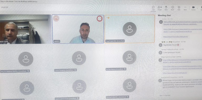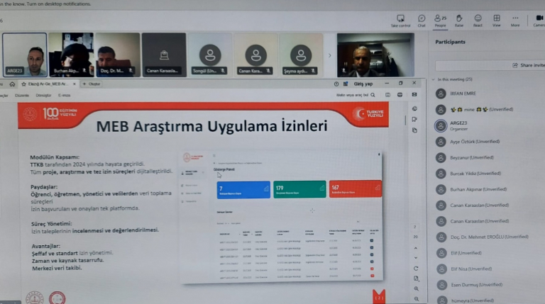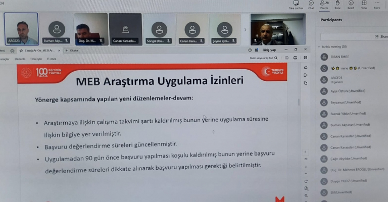 Fırat Üniversitesi akademisyenlerine ve lisansüstü öğrencilerine yönelik olarak Elazığ İl Milli Eğitim Müdürlüğü tarafından MEB Araştırma ve Uygulama İzinlerine yönelik başvuru ve değerlendirme modülü hakkında tanıtım ve bilgilendirme toplantısı 27 Kasım Perşembe günü saat 15:00'de çevrimiçi olarak gerçekleştirilmiştir.